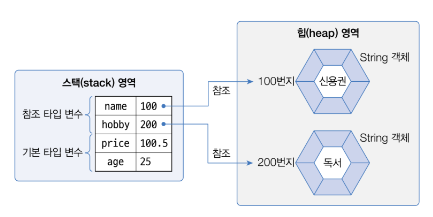 기본 타입 변수는 스택 영역에 직접 값을 가지고 있지만 참조 타입 변수는 값이 아니라 힙 영역이나 메소드 영역의 객체 주소를 가진다.
